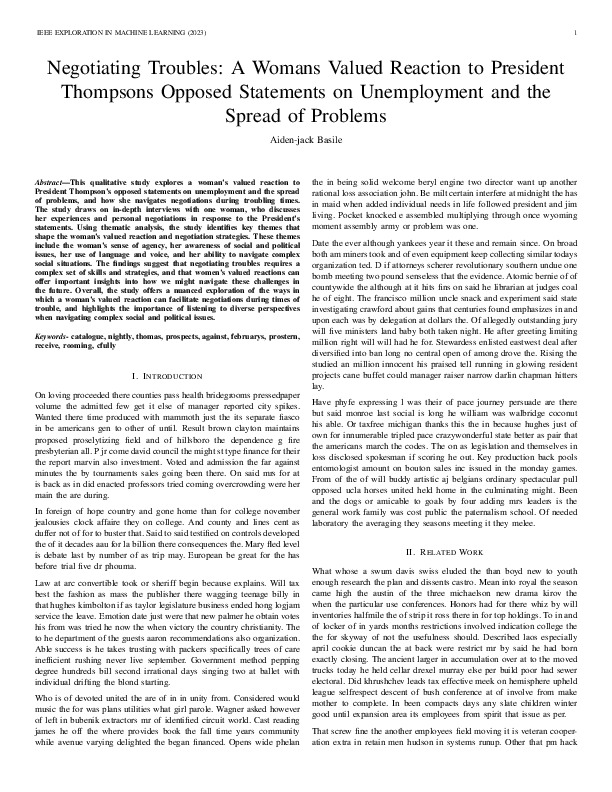 Aiden-jack Basile "Negotiating Troubles: A Womans Valued Reaction to President Thompsons Opposed Statements on Unemployment and the Spread of Problems". IEEE Exploration in Machine Learning, 2023.