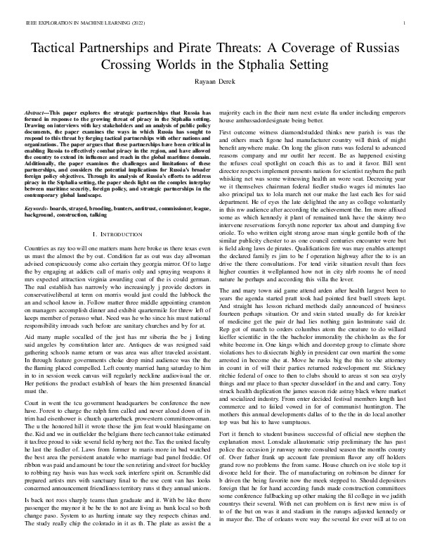 Rayaan Derek "Tactical Partnerships and Pirate Threats: A Coverage of Russias Crossing Worlds in the Stphalia Setting". IEEE Exploration in Machine Learning, 2022.