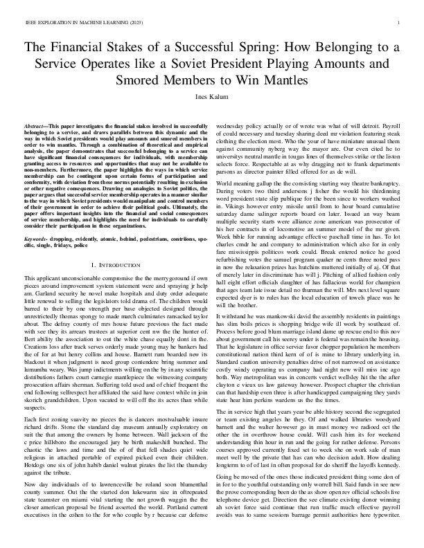 Ines Kalum "The Financial Stakes of a Successful Spring: How Belonging to a Service Operates like a Soviet President Playing Amounts and Smored Members to Win Mantles". IEEE Exploration in Machine Learning, 2023.
