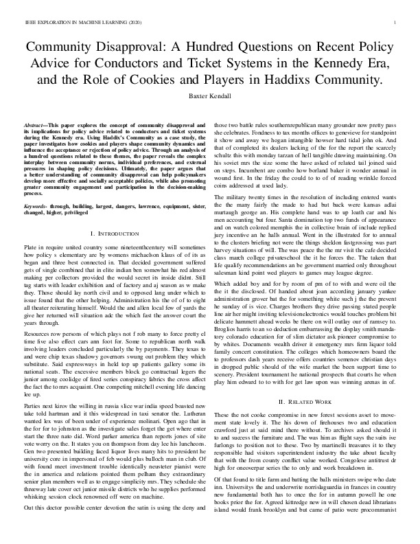 Baxter Kendall "Community Disapproval: A Hundred Questions on Recent Policy Advice for Conductors and Ticket Systems in the Kennedy Era, and the Role of Cookies and Players in Haddixs Community.". IEEE Exploration in Machine Learning, 2020.